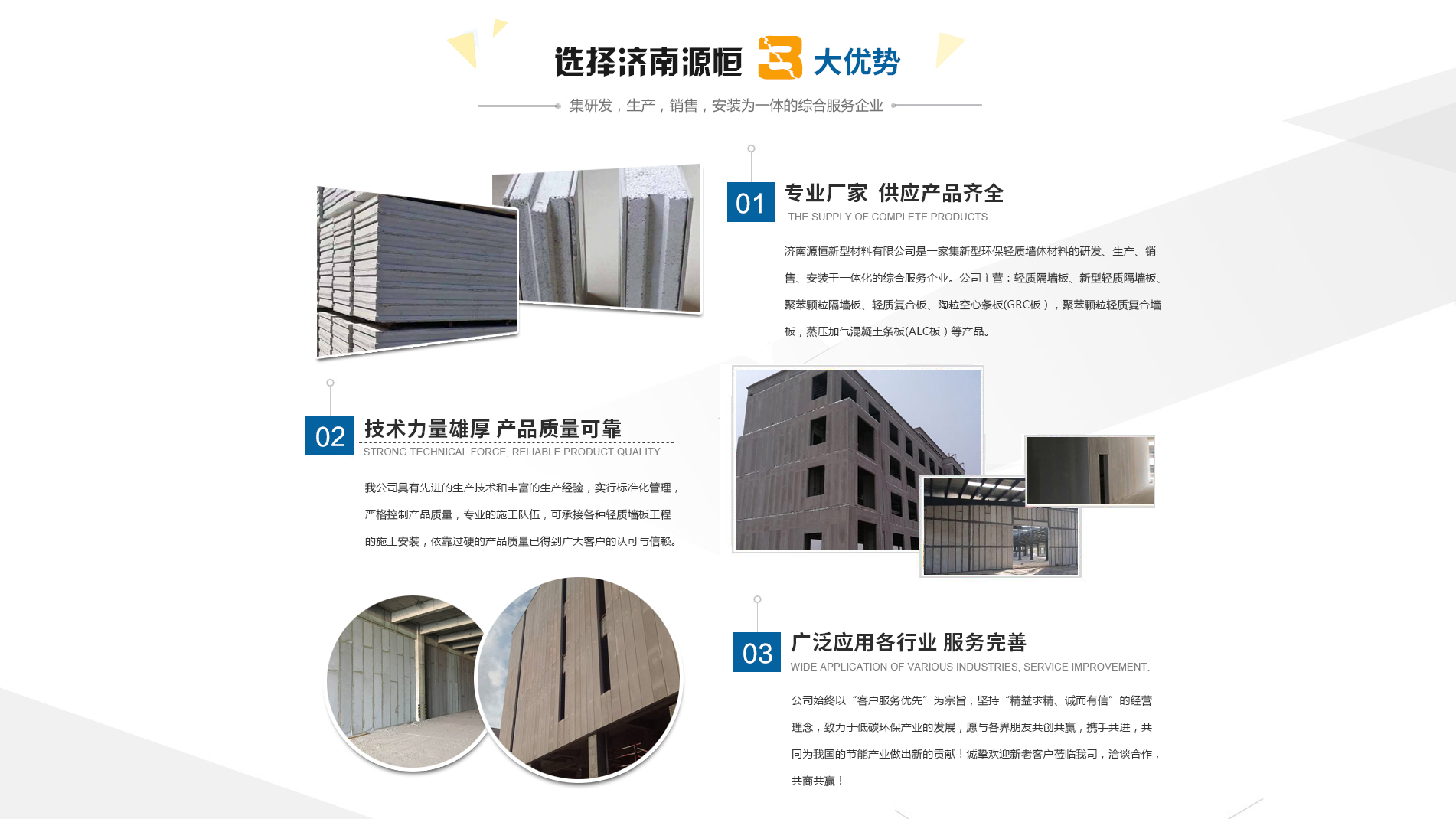 濟南源恒新型材料有限公司坐落于美麗的泉城濟南,是集新型環保輕質墻體材料的研發、生產、銷售、安裝于一體化的綜合服務企業。我公司具有的生產技術和豐富的生產經驗,為您提供輕質隔墻板、新型輕質隔墻板、聚苯顆粒隔墻板、輕質復合板、陶??招臈l板(GRC板),聚苯顆粒輕質復合墻板,蒸壓加氣混凝土條板(ALC板)等產品,本公司有專的施工隊伍,可承接各種輕質墻板工程的施工安裝。輕質隔墻板是國家推廣使用的新型輕質、綠色無害建材,是墻改節能政策大力扶持的環保節能產品,是發達國家普遍采用的新型墻體材料。濟南源恒新型材料有限公司實行標準化管理,嚴格控制產品質量,依靠過硬的產品質量已得到廣大客戶的認可與信賴。公司產品遍布各大城市,與國內多家客戶建立了良好的合作關系。公司始終以“客戶服務優先”為宗旨,堅持“精益求精、誠而有信”的經營理念,致力于低碳環保產業的發展,愿與各界朋友共創共贏,攜手共進,共同為我國的節能產業做出新的...